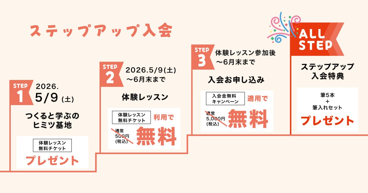 新生活が落ち着いてから習い事をじっくり探したい、5月以降の入会を検討している方は「ステップアップ入会」がおすすめです。以下のステップを踏んでご入会いただくと、先着10名のお子さまに筆5本&筆入れセットをプレゼントします!