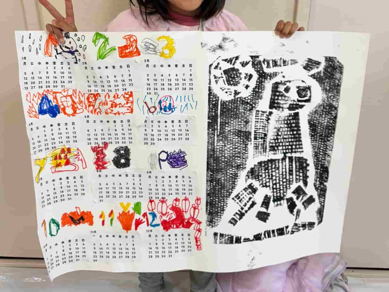 1週目はうまの横顔を描きました。毛糸を貼り付けて、ふわふわのたてがみを再現しています。「身体は写真の通りに塗って、たてがみだけ虹色にしたい」「身体とたてがみをおんなじ色にしたい」とこどもたちのこだわりのアイデアが次々聞こえてきました。2週目は毎年生徒たちや保護者の皆様に大好評の、十二支の版画づくり。足が関節で曲がり、蹄に繋がっている様子をじっくり観察し、膝上・膝下・蹄とパーツを切り替えて立体感を表現したり、なかにはユニコーンにするため翼を生やした作品も!3週目に版画を刷り上げたときには、モノクロでかっこよく仕上がった様子に安心した子どもたちの表情が印象的でした。版画のとなりには2026年のカレンダーを製作。モノクロの版画と、カラフルなカレンダーの対比がとても美しい作品ができあがりました。空いたスペースに2026年の嬉しかったことや思い出を書き込むのも楽しそうですね。子どもたちらしいさらなるアレンジを1年間楽しんでもらえたらと思います。