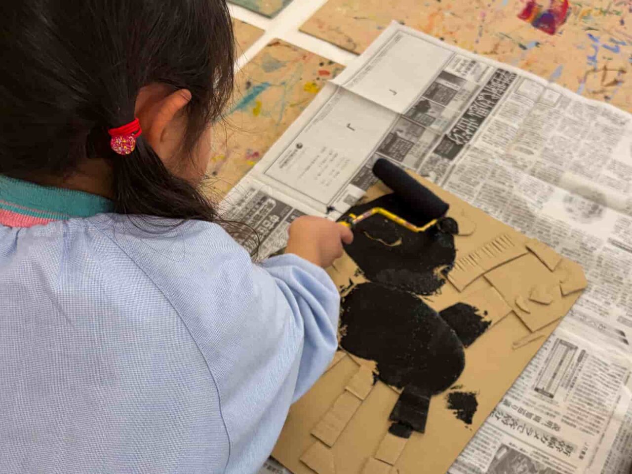 1週目はいろはかるたを制作しました。いろはかるたに使われていたことわざは、地域によって異なるようです。今回は関東で地域で使われていたいろはかるたの一覧から気になる言葉を選び、かるたを制作しました。少人数だった時間帯には実際につくったかるたで遊び、文化に親しみました。2週目・3週目は張り子の技法で起き上がりこぼしを制作。風船を土台にすることで空洞を作り、中におもりを入れて制作しました。おもりはなんとビー玉!身近なおもちゃが動力となっている起き上がりこぼしの不思議な動きにみんな興味津々。小さな新聞と半紙を何層も貼る大変な作業でしたが、2週間にわたる制作も先生やお友達との会話を楽しみながら一生懸命取り組んでいました。