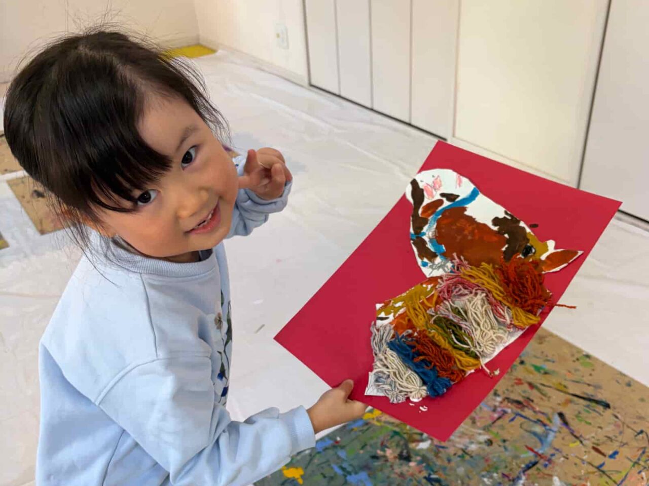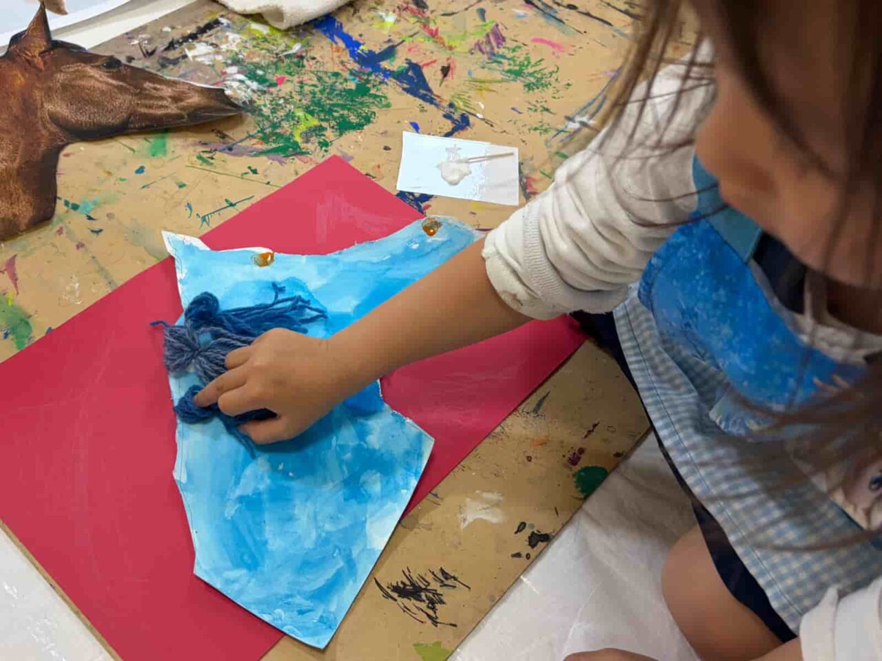 1週目・ 2週目は大きな猫の絵を制作しました。1週目は目と鼻をじっくり観察して大きく描き、2週目に細くちぎった紙袋を毛に見立てたコラージュアートに仕上げました。今回、目の色塗りにはクレヨンを使っています。クレヨンを何層にも塗り重ねて、光やものの反射で、さまざまな色が映り込んだ美しい瞳を描きました。子どもたちは紙の端で何度も練習してから丁寧に塗っています。紙をちぎる作業も手が空いた子どもたちが行い、見えないところで協力し合って作品ができあがっていますよ。3週目は猫のお面作り。元の型をより猫らしい顔の形にするため、頬の部分に粘土を盛るところからスタートしました。家で飼っている猫をイメージしたり、猫といえば…のキャラクターの色にしたり、子どもたちの好きな色や素材で、とっておきの猫が出来上がりました。
