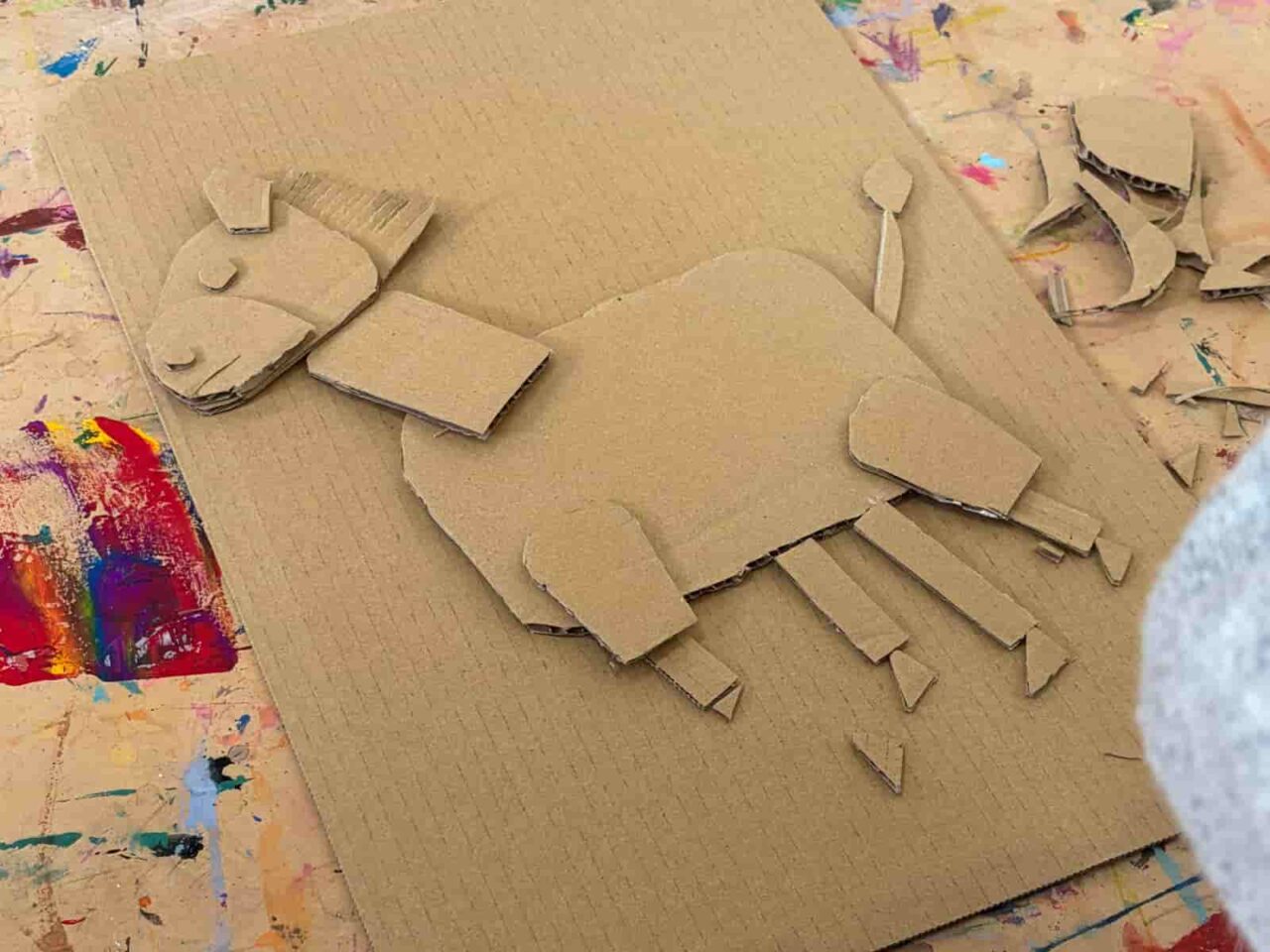 1週目は誰かの暮らしを想像して、おうちのイメージアートを描きました。暮らしているのは誰か、その人は何階建ての家に住んでいるか、誰とどんな生活をしているか…くらしのストーリーを想像して先生たちと言葉で表現しながら描いていきました。アイデアを言葉にすることで自分で整理しつつ、他の生徒さんはそれを聞いてまた新たなアイデアが生まれていきます。2週目・3週目はダンボールハウス制作にチャレンジ。屋根や壁を塗り、家の内装・お庭づくりを通して、暮らしをイメージしました。2週間で合計3時間〜4時間、それよりもっと長く黙々と集中して取り組んでいた生徒さんも!おうちにはテーブルや冷蔵庫、テレビ、それから…と次々つくるものを決めていました。つくるのが難しそうなものでも諦めず模索して作り続けていくこどもたち。ものづくりが好きだからこその継続力と集中力を発揮していました!