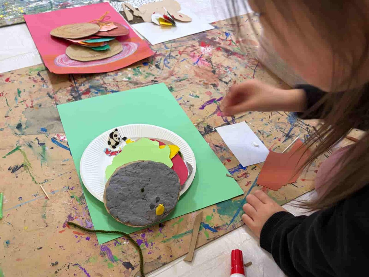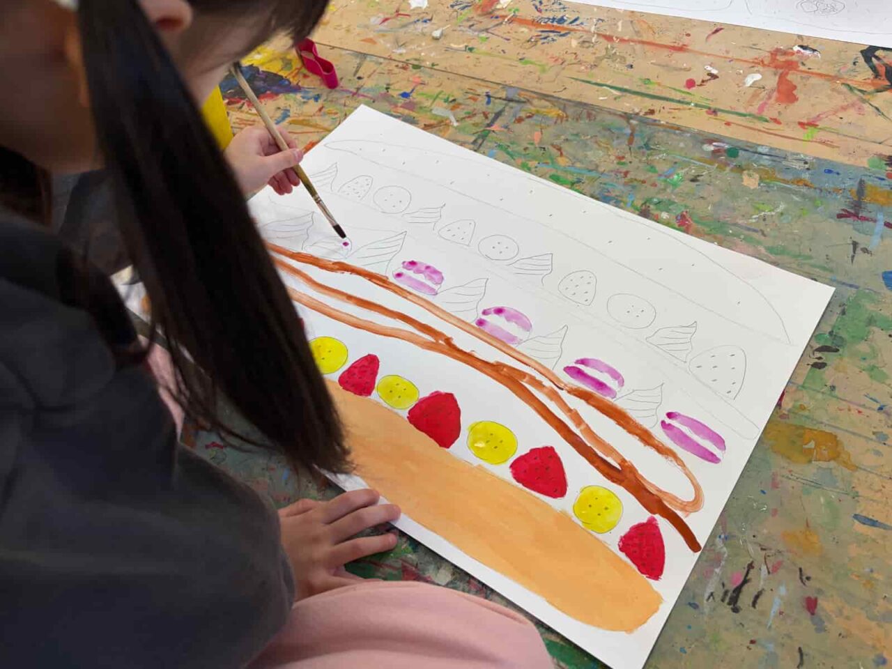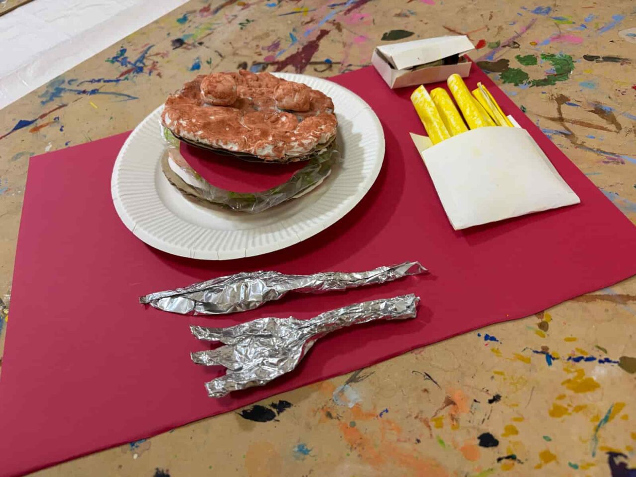 1週目はハンバーガーのアイデアアートを描きました。1月に制作したハンバーガーは、誰のためでも・何を挟んでもOK。人間が食べられてもいいし、食べられなくてもいいよ、とアイデアは子どもたちに委ねていました。ハンバーガーと聞いて、自分が好きな具材を次々に口にしだす子どもたち。そこから好きな具材が同じ子同士アイデアを持ち寄ったり、あえて面白い具材を提案して一緒に笑い合ったりと、教室内ではさまざまなアイデアトークが交わされていました。2週目はハンバーガーの具材をつくり、3週目にはそれを毛糸で繋いだハンバーガーを制作しました。子どもたちのこだわりポイントはそれぞれで、一つひとつの具材に丁寧に取り掛かったり、具材の数を盛りだくさんにしたりしていました。ハンバーガーショップの店員さんになりきって具材を紹介したり、積み重ねて頬張るようなポーズをしてごっこ遊びをしていたのも印象的です。作品づくりの中でも遊びを見出す子どもたちの素敵な力を実感しました。