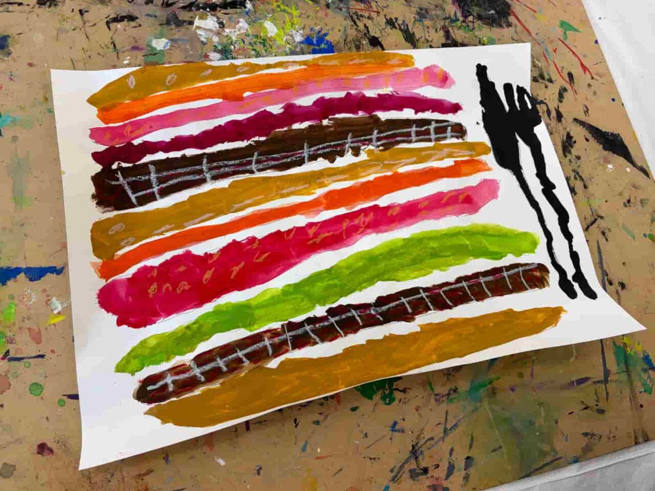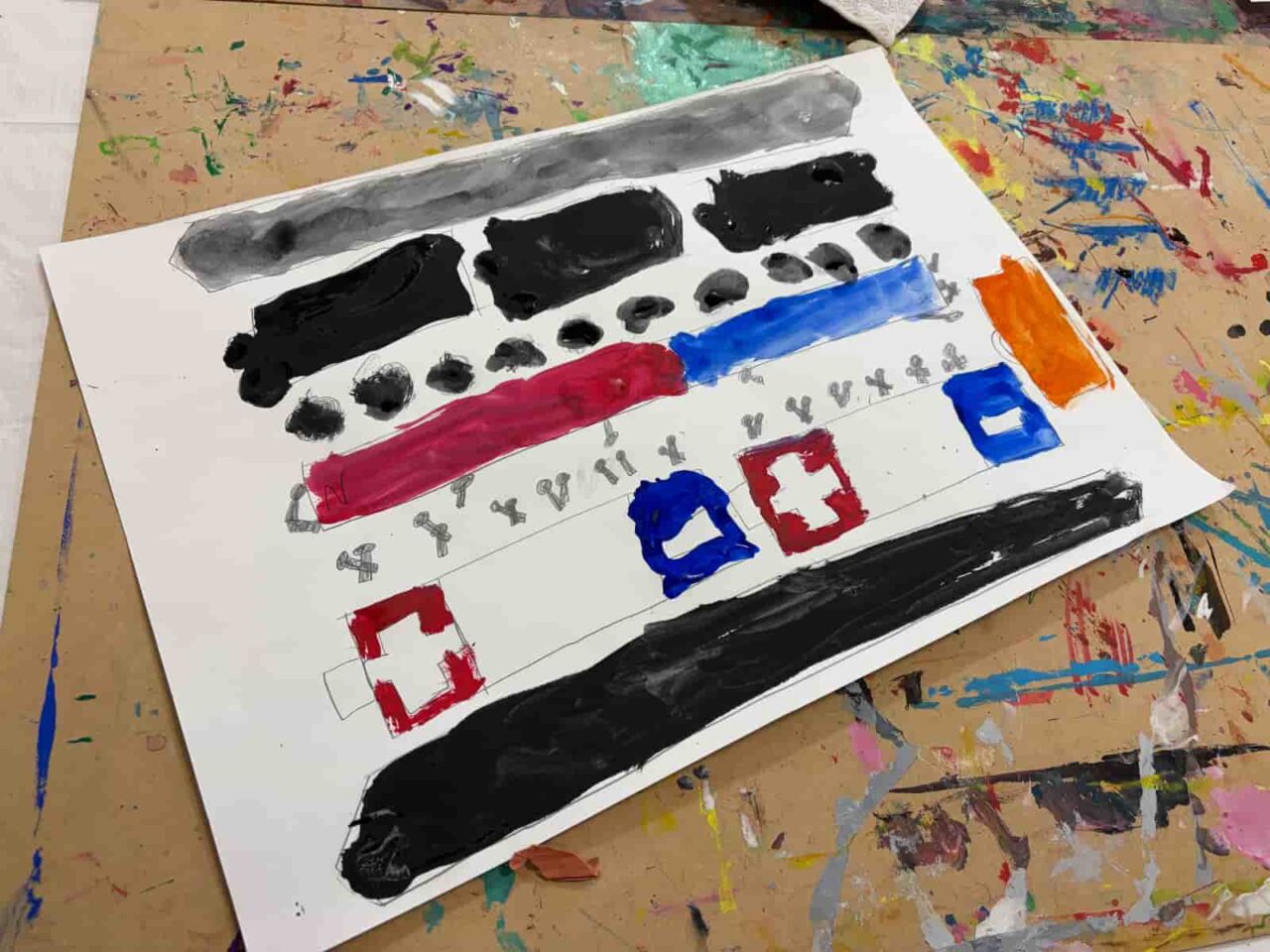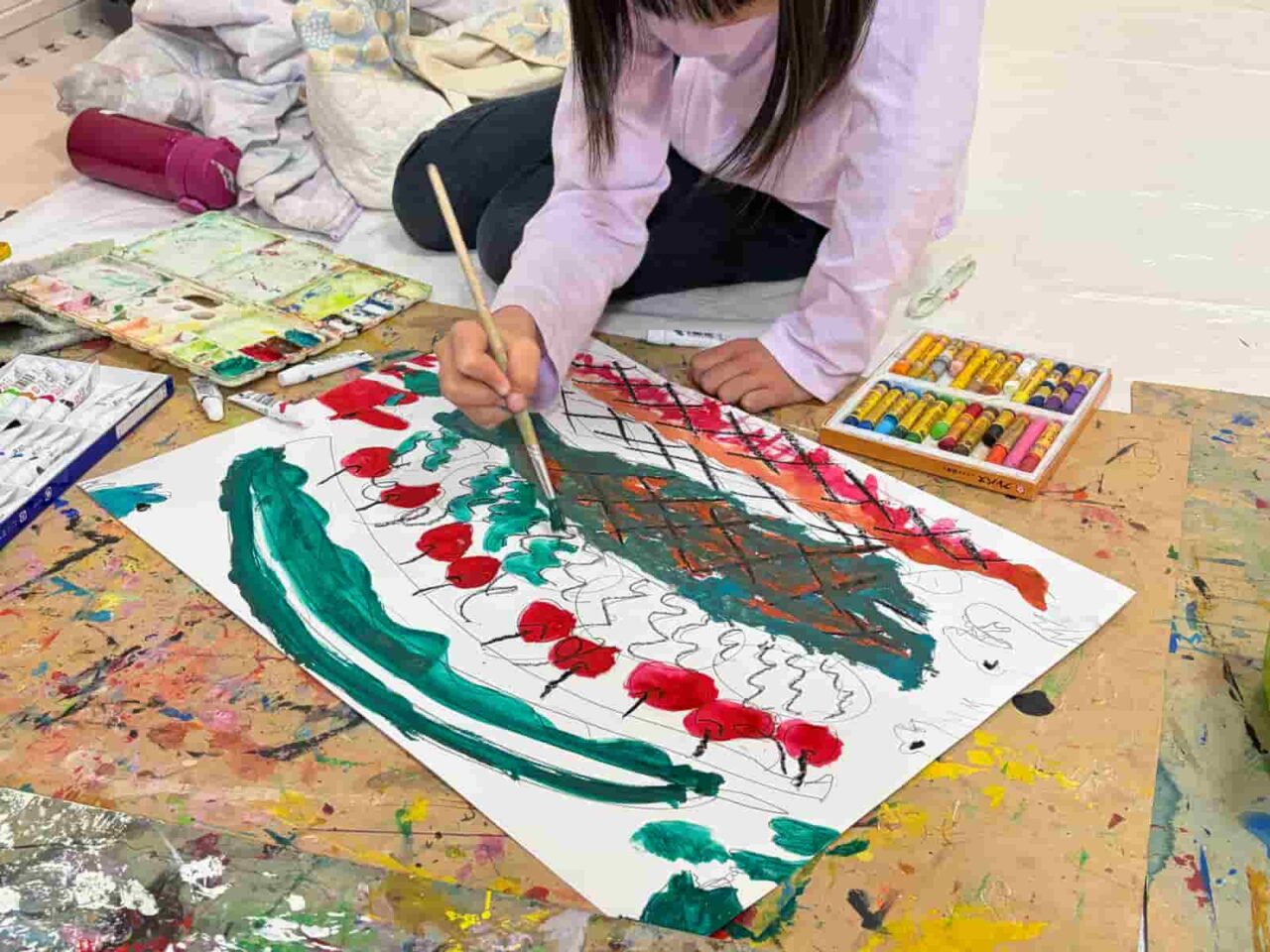1週目はハンバーガーのアイデアアートを描きました。1月に制作したハンバーガーは、誰のためでも・何を挟んでもOK。人間が食べられてもいいし、食べられなくてもいいよ、とアイデアは子どもたちに委ねていました。ハンバーガーと聞いて、自分が好きな具材を次々に口にしだす子どもたち。そこから好きな具材が同じ子同士アイデアを持ち寄ったり、あえて面白い具材を提案して一緒に笑い合ったりと、教室内ではさまざまなアイデアトークが交わされていました。2週目はハンバーガーの具材をつくり、3週目にはそれを毛糸で繋いだハンバーガーを制作しました。子どもたちのこだわりポイントはそれぞれで、一つひとつの具材に丁寧に取り掛かったり、具材の数を盛りだくさんにしたりしていました。ハンバーガーショップの店員さんになりきって具材を紹介したり、積み重ねて頬張るようなポーズをしてごっこ遊びをしていたのも印象的です。作品づくりの中でも遊びを見出す子どもたちの素敵な力を実感しました。