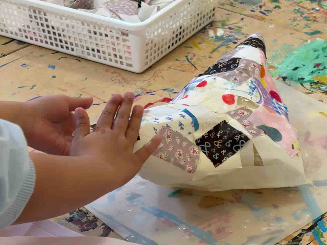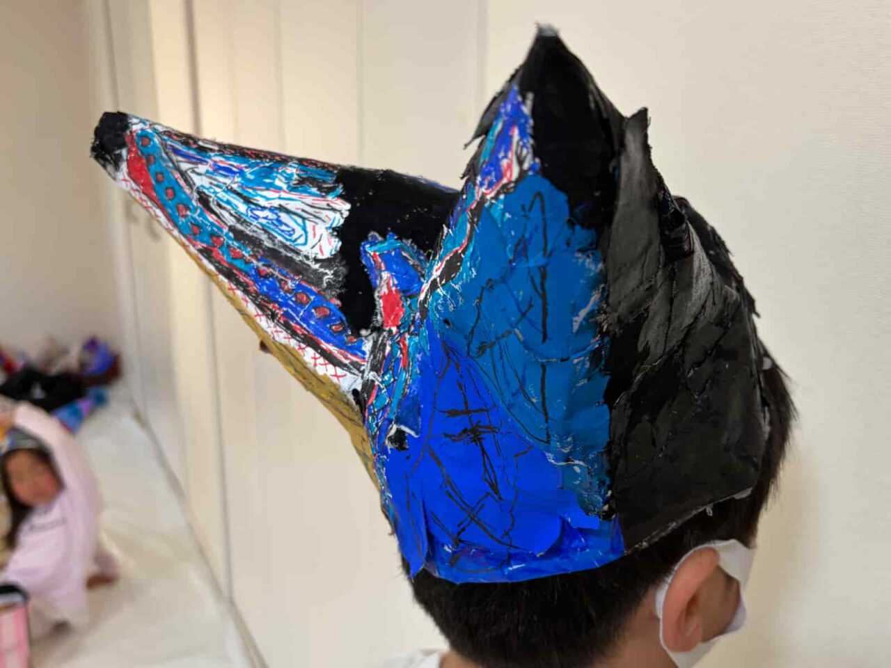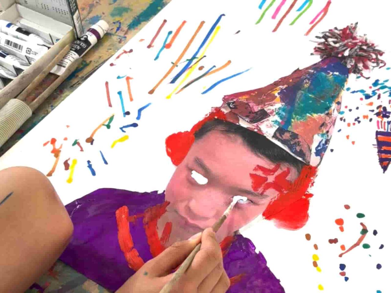 道化師やサーカスというと、ピエロという名称が一番に思いつく方が多いのではないでしょうか?ピエロは実は、悲しい顔をした役の名前なんだそう。国を超えて伝わった言葉の意味の違いに触れるところからレッスンがスタートしました。会話をしていく中で子どもたちからは、風船をくれる笑顔のやつでしょ?、赤い鼻でアフロのキャラクターでしょ?、ホラーゲームでみたことある!怖いやつでしょ?…同じ「ピエロ」という言葉でも、子どもたちによってさまざまなイメージがあることがわかりました。今回はみんなを楽しませてくれる道化師に、ということで、1週目・2週目は、サーカスの道化師の帽子をつくりました。 今回は子どもたちの頭の型を取るところからスタートしています。子どもたちの頭にラップを巻いて、その上から形を固定するためにテープを貼りました。そこにさらに布を貼っているので、硬さもありつつ、一人ひとりにぴったりサイズの帽子になっています。3週目は写真の上から道化師のメイクを施していきました。楽しいサーカスの道化師にしたり、あえて悲しい顔のピエロに仕上げたり、子どもたちが自由に表現を楽しんでくれていました。