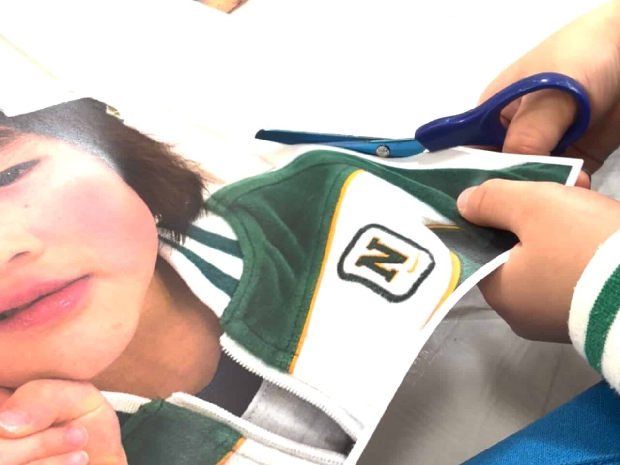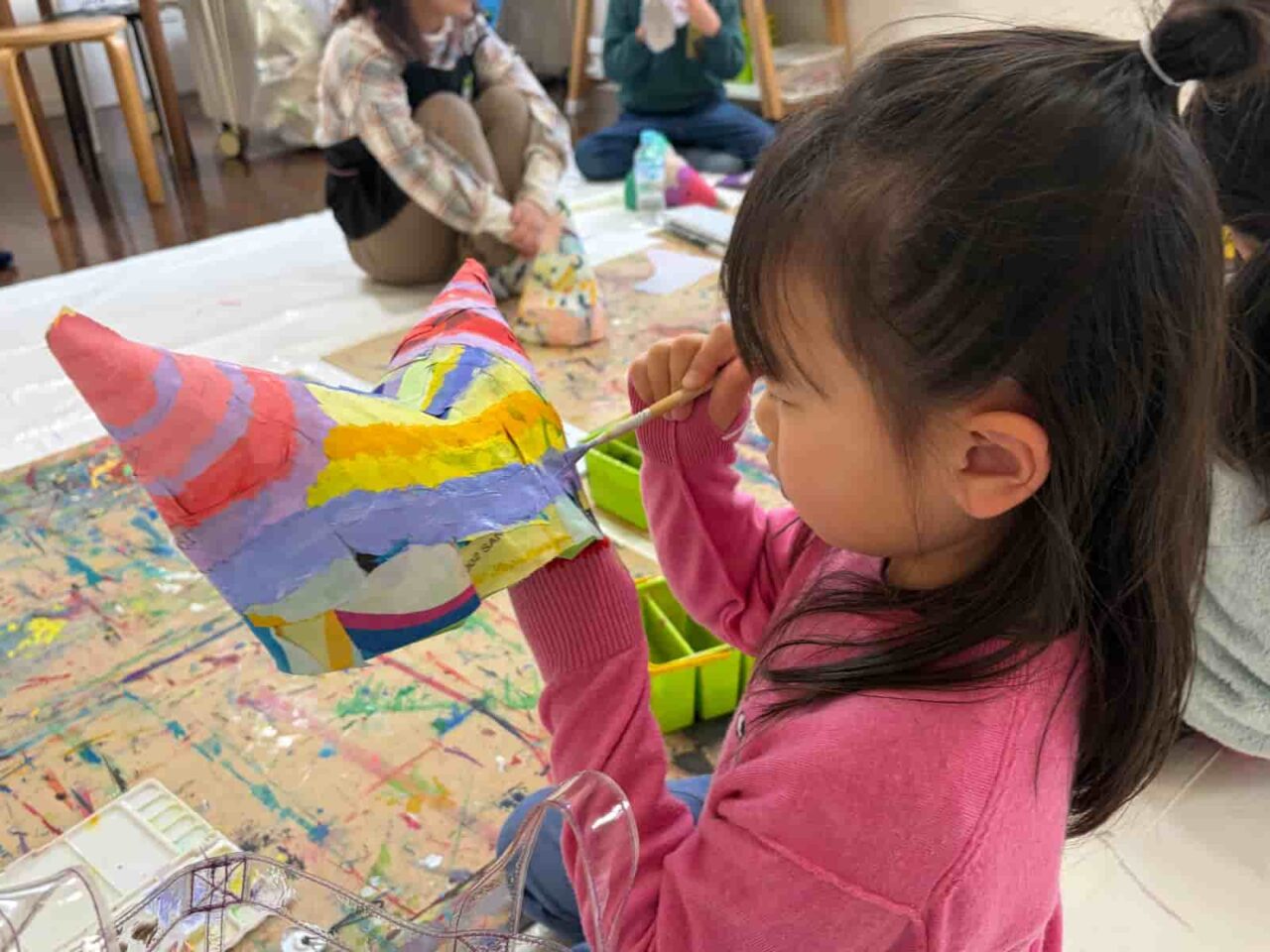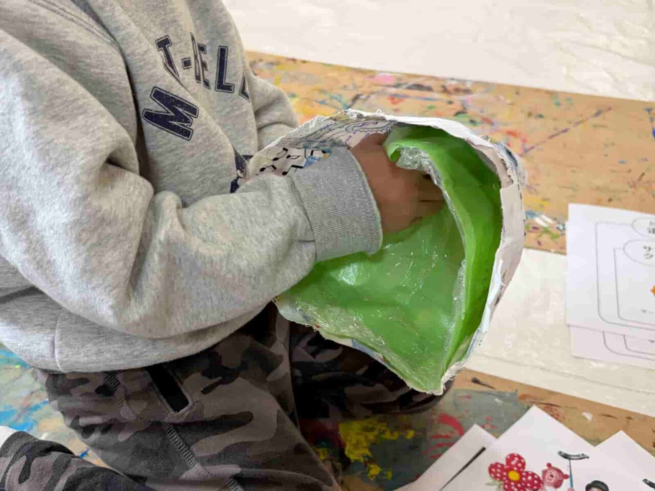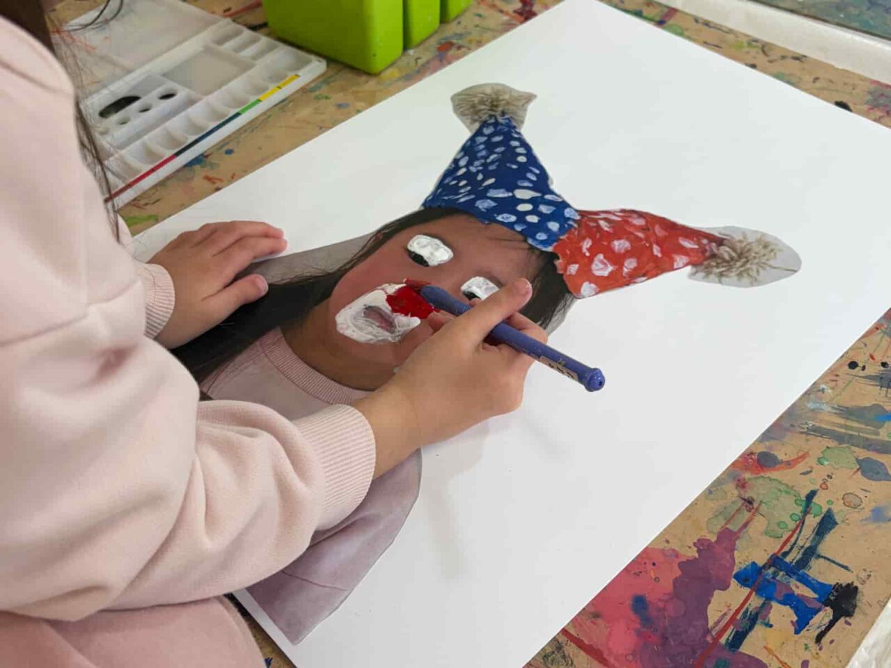 道化師やサーカスというと、ピエロという名称が一番に思いつく方が多いのではないでしょうか?ピエロは実は、悲しい顔をした役の名前なんだそう。国を超えて伝わった言葉の意味の違いに触れるところからレッスンがスタートしました。会話をしていく中で子どもたちからは、風船をくれる笑顔のやつでしょ?、赤い鼻でアフロのキャラクターでしょ?、ホラーゲームでみたことある!怖いやつでしょ?…同じ「ピエロ」という言葉でも、子どもたちによってさまざまなイメージがあることがわかりました。今回はみんなを楽しませてくれる道化師に、ということで、1週目・2週目は、サーカスの道化師の帽子をつくりました。 今回は子どもたちの頭の型を取るところからスタートしています。子どもたちの頭にラップを巻いて、その上から形を固定するためにテープを貼りました。そこにさらに布を貼っているので、硬さもありつつ、一人ひとりにぴったりサイズの帽子になっています。3週目は写真の上から道化師のメイクを施していきました。楽しいサーカスの道化師にしたり、あえて悲しい顔のピエロに仕上げたり、子どもたちが自由に表現を楽しんでくれていました。